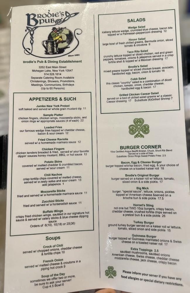 Welcome to Brodie's Pub, a quintessential Irish pub located at 3262 E Main St, Mohegan Lake, NY. With a relaxed ambiance and a diverse menu, we offer a delightful dining experience featuring local specialties, excellent cocktails, and an extensive beer selection. Join us for lunch, dinner, or enjoy a leisurely brunch with friends. Our vibrant atmosphere is perfect for concerts, sports events, and friendly gatherings, with accessible seating and amenities for everyone. With takeout options, catering services, and happy hour discounts, there's something for everyone at Brodie's Pub. Come savor the taste of community and tradition!