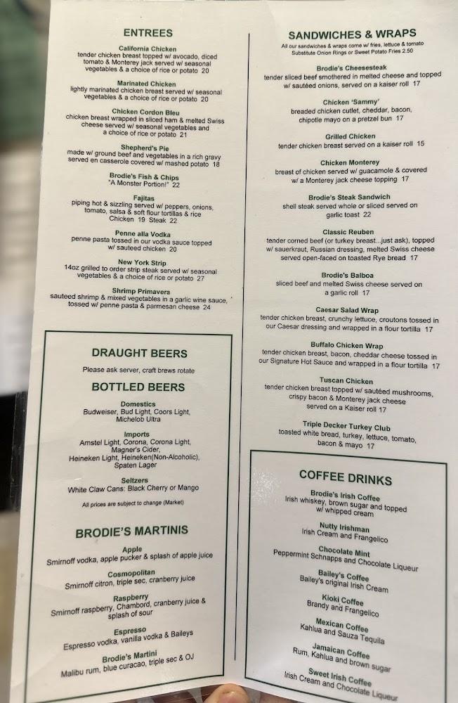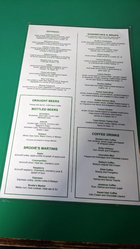 Prices are reasonable, with entrees averaging around $15. The dessert options end meals on a sweet note. Brodie's Martininis complete the dining experience after a flavorful meal. Don’t miss out on this complete pub experience!