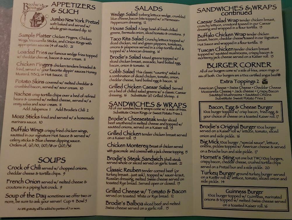 Brodie's Pub features a diverse menu that satisfies most cravings. You'll find classic pub fare like burgers, salads, and hearty entrees. Options such as the California Chicken and Jumbo New York Pretzel are popular picks. Each dish stands out for its flavor and presentation.